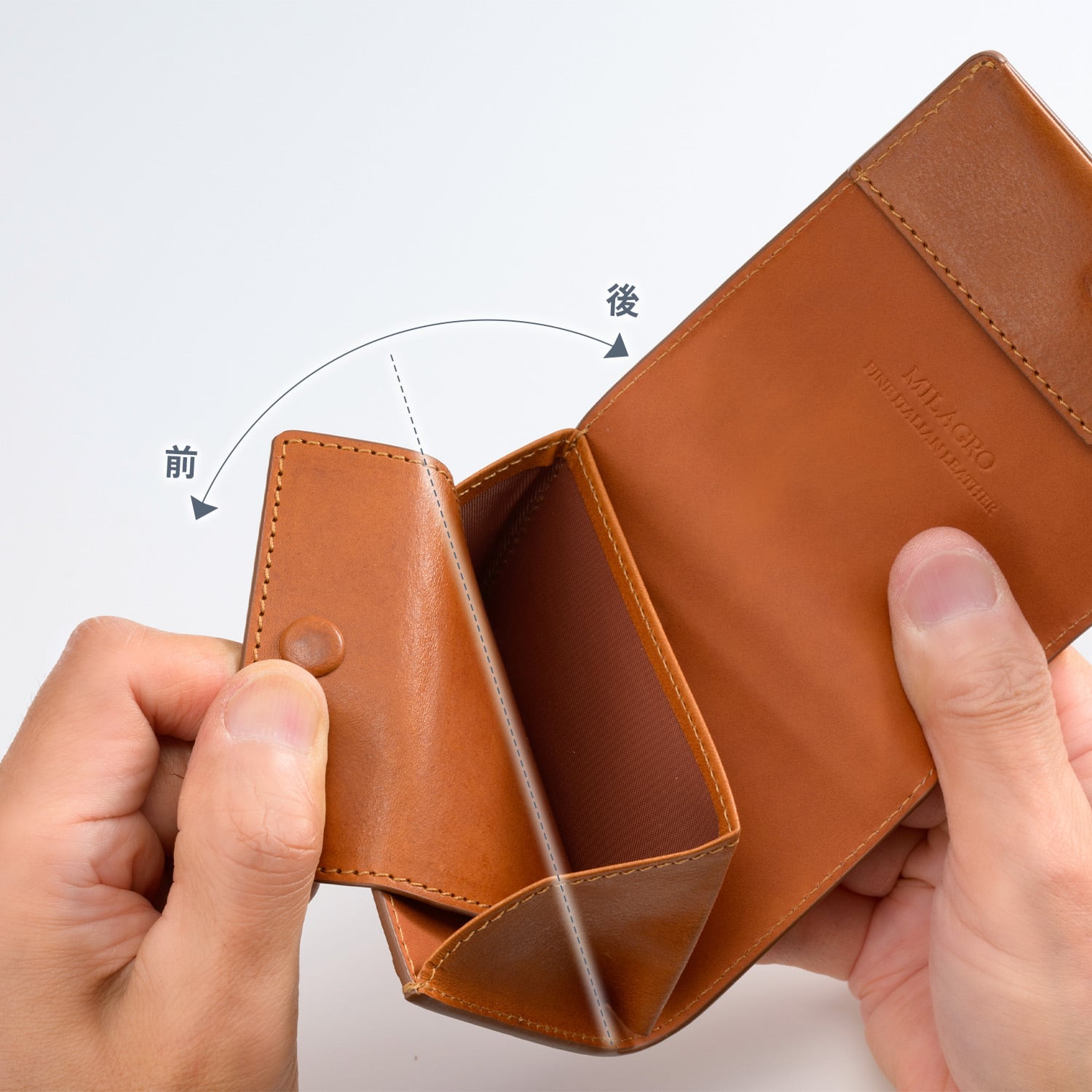 小銭入れとカード入れは1室設計になっており、真ん中にはフラップ付きの仕切りがついています。この仕切りが前後に可動することで小銭やカードの取り出しを容易にしてくれます。