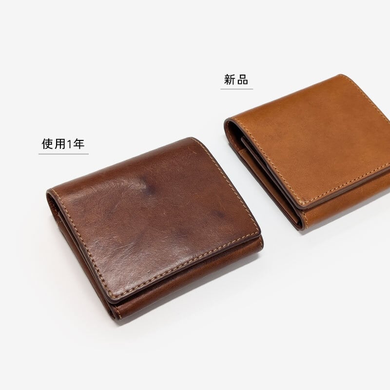 使うことで、革表面が色濃く、艶が増していきます。また、新品は革に張り、見た目に厚みを感じます。しかし、使用することで革が馴染んで薄くなっていきます。