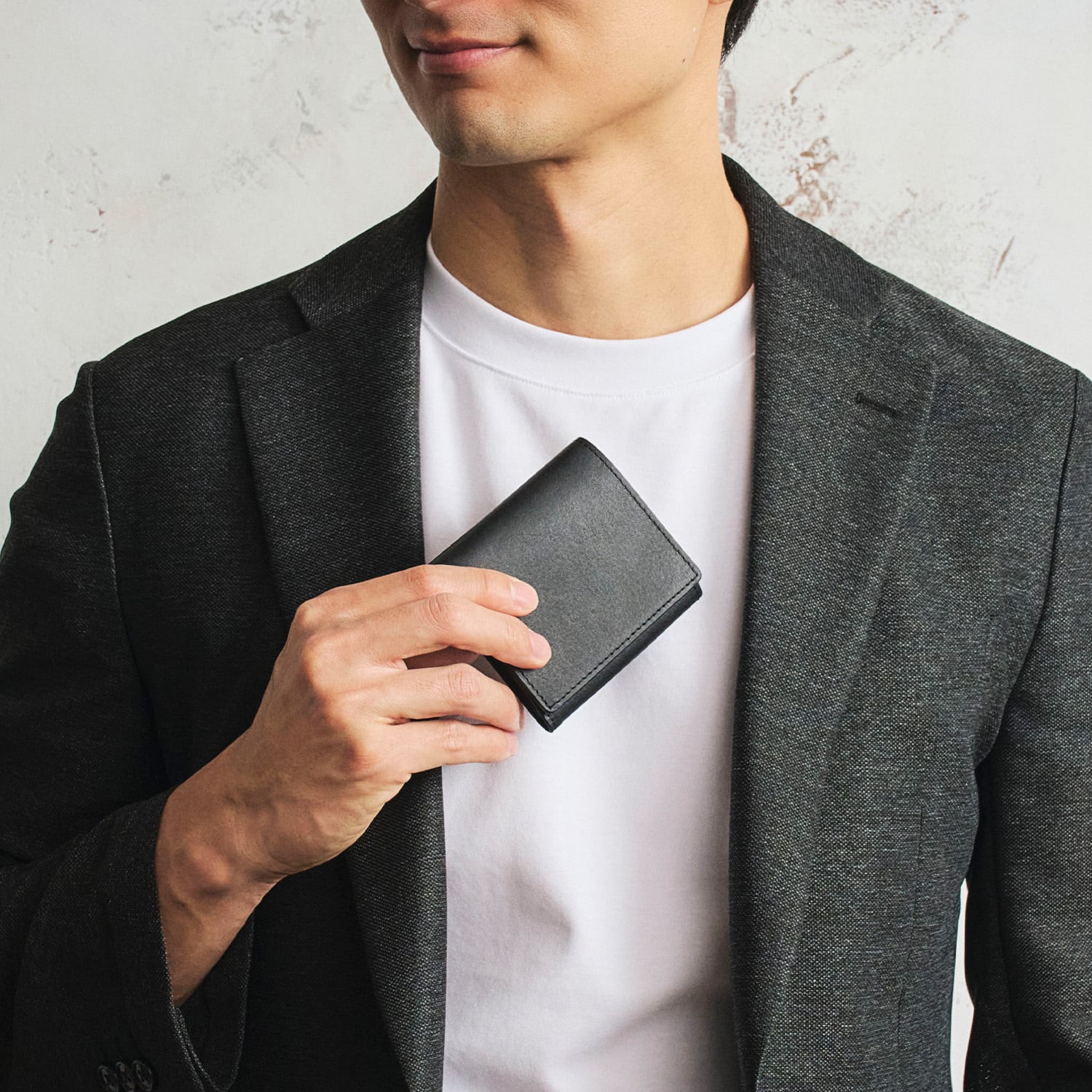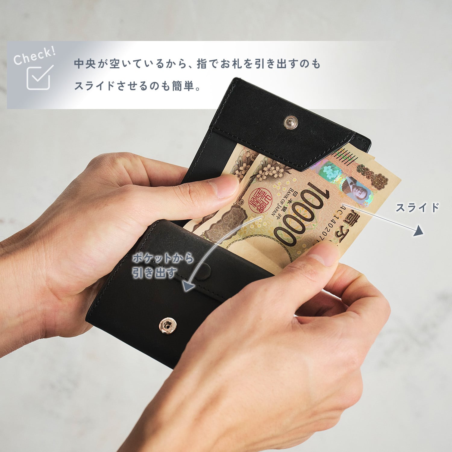 お札は上部のコーナーポケットでしっかり固定され、スライド収納で出し入れもラクラク。使いやすさと安心感を兼ね備えた、コンパクトで機能的な財布です。