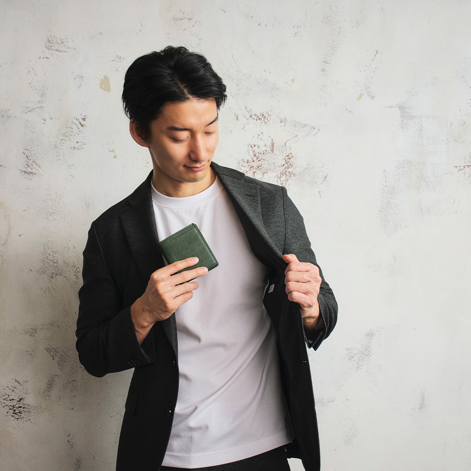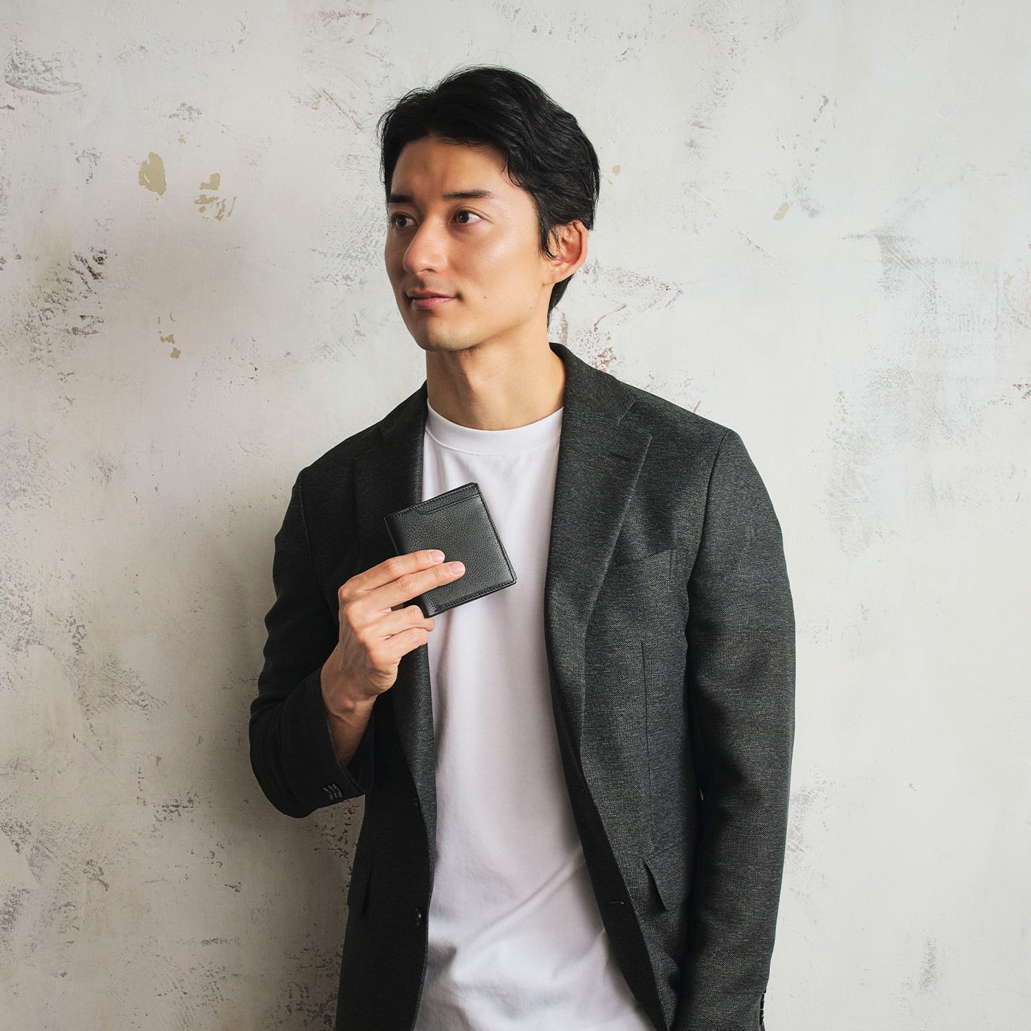 お札、小銭、カードが過不足なく入って、掴みやすい小ぶりなサイズが嬉しい2つ折り財布です。胸ポケットにもすっぽり。また、便利なマネースルー機能が備わっており、小銭入れからもお札を取り出すことが可能です。ビジネスからカジュアルまで幅広く使えるルックスです。