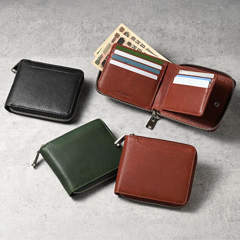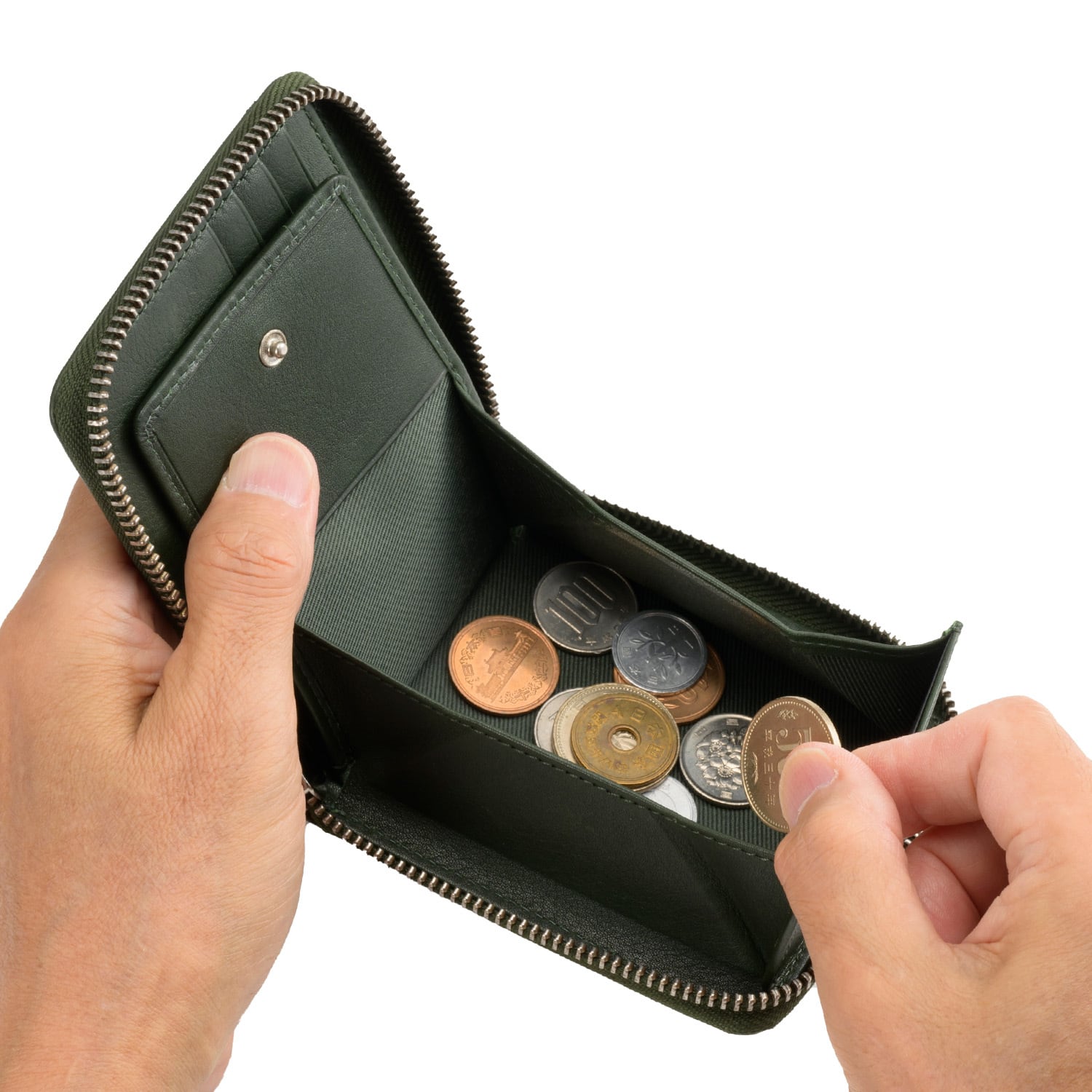 ぐるっと一周をファスナーで囲んでいるから、財布を傾けても中身が飛び出す心配がありません。旅行や移動中など、大切なカードや現金をしっかり守ります。さらに、大きく開くので中身がひと目で確認でき、必要なカードや小銭もスムーズに取り出せます。安全性と使いやすさを両立した、頼もしいお財布です。