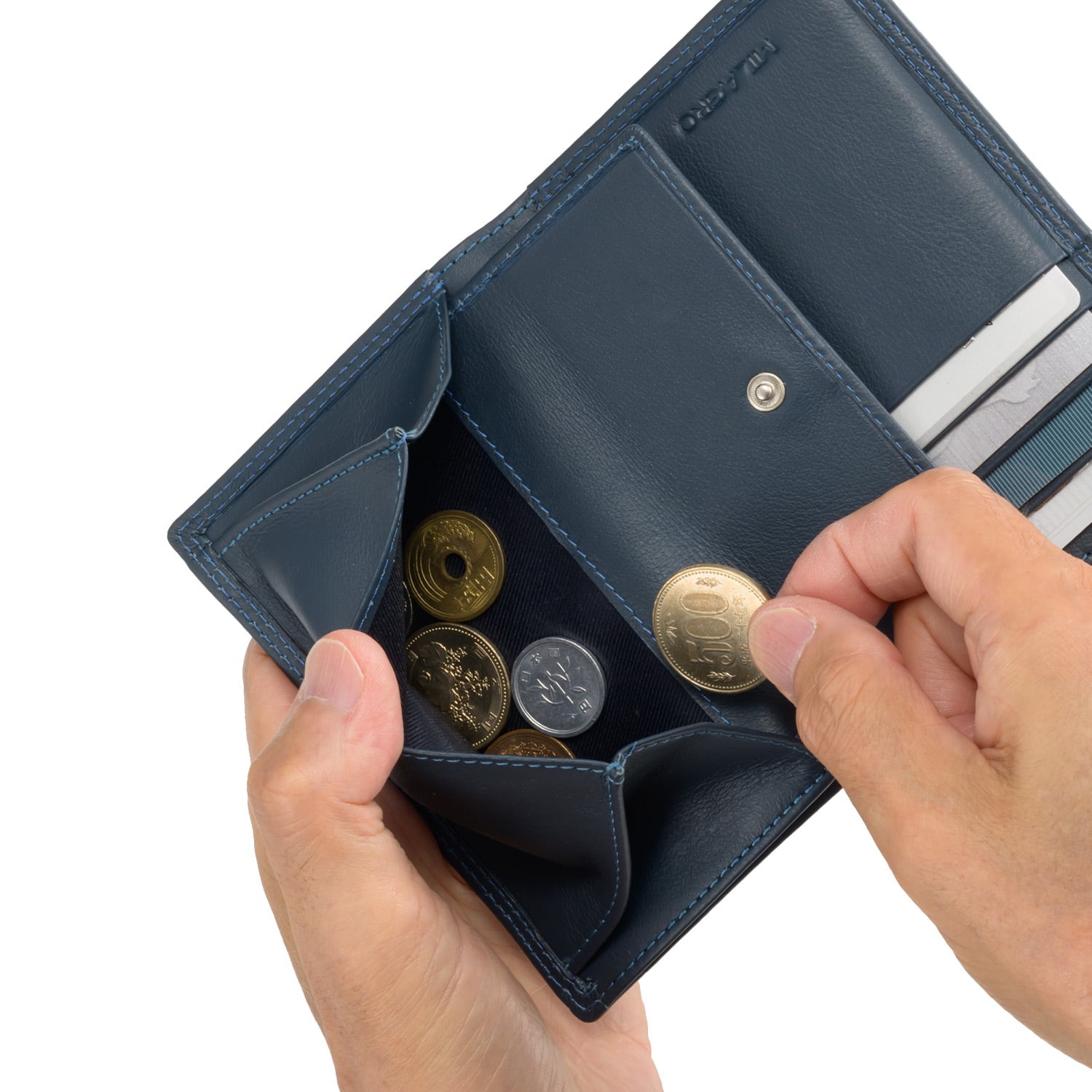 細長いシルエットが美しい2つ折り財布。横長の小銭入れは中身をひと目で確認でき、小銭が重なりにくい設計で、厚みを抑えたスマートな印象を保ちます。ポケットにも収まりやすく、スマートに持ち歩けます。