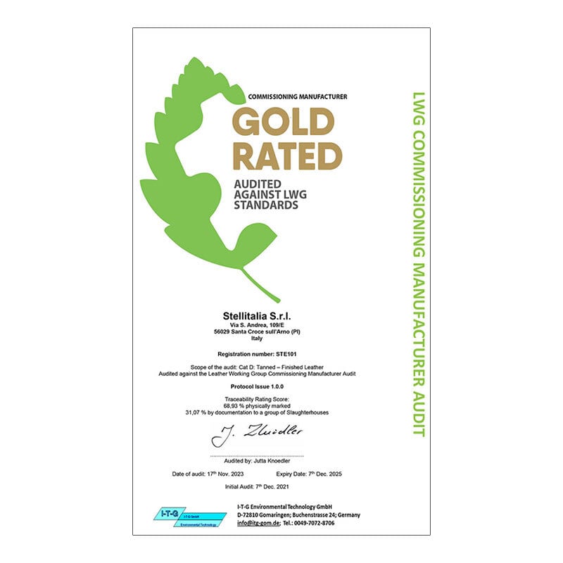 ※STELLATALIA社は環境に配慮した製革プロセスを持つLWG(レザーワーキンググループ)の中でも最高のゴールド認定のタンナーとして知られる会社です。