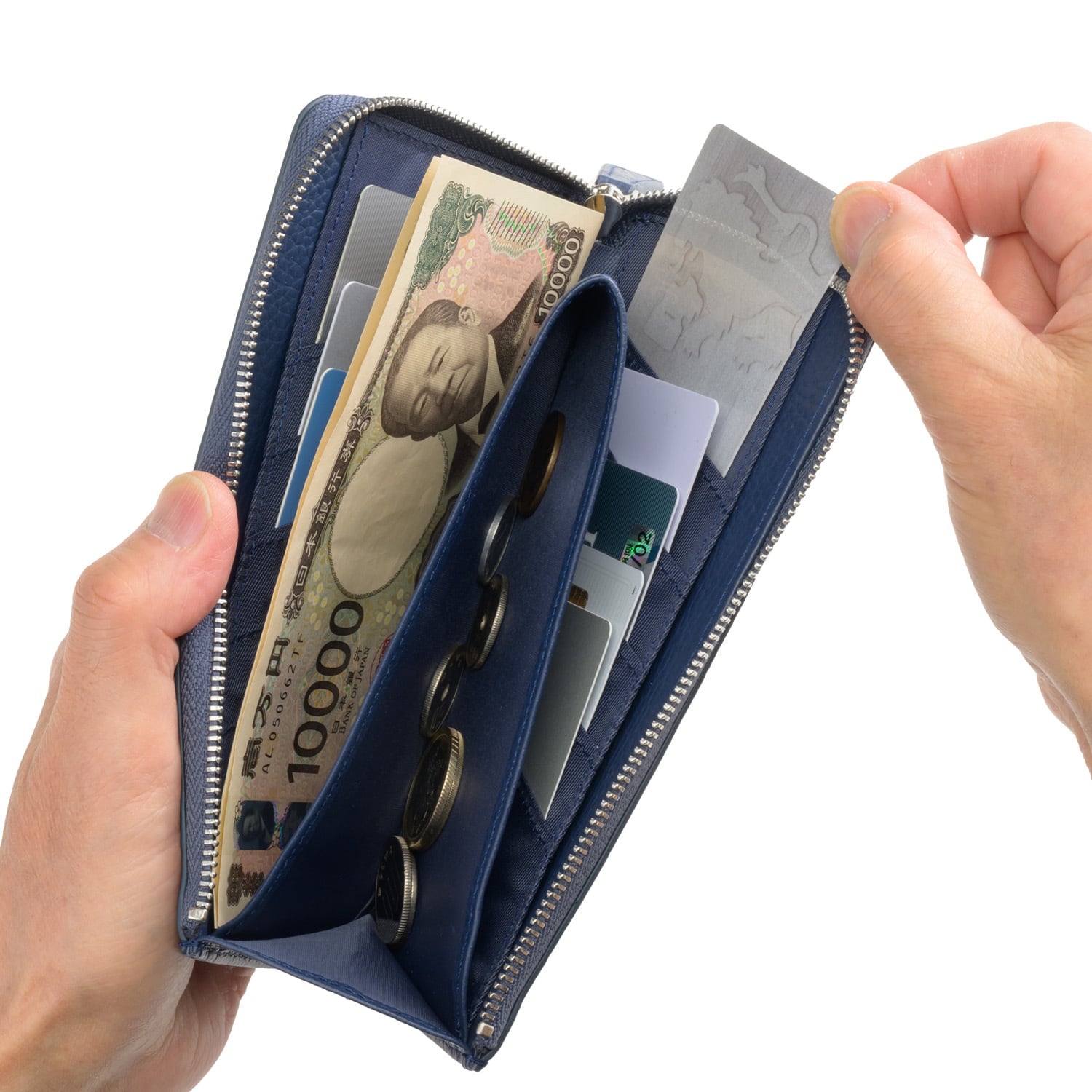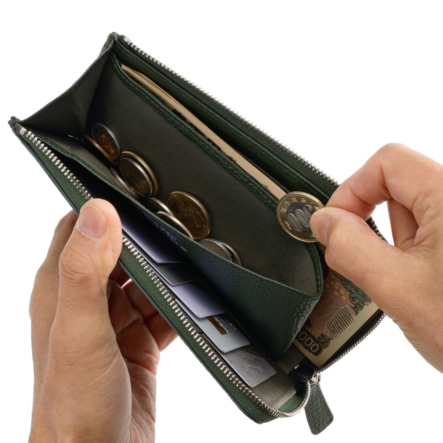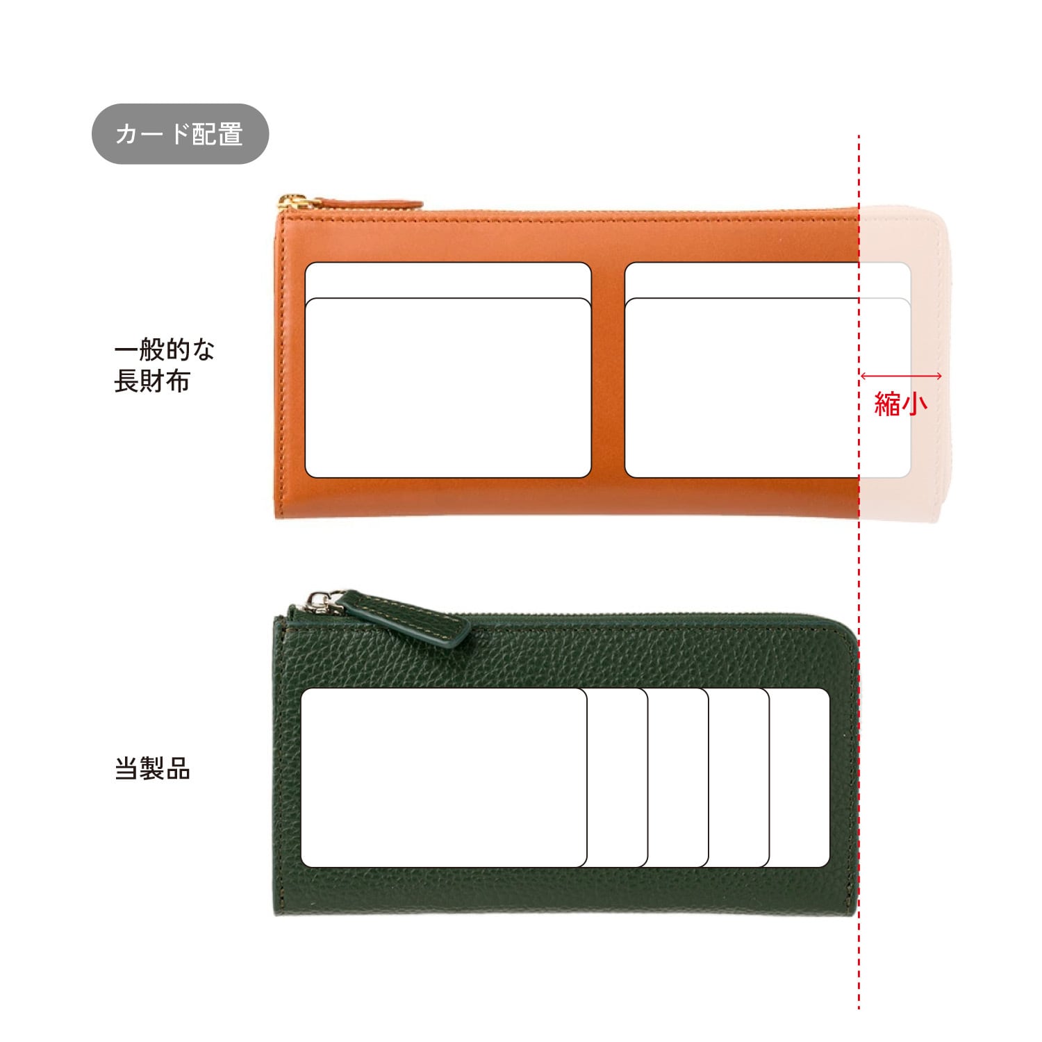 お札サイズに合わせたコンパクト設計のL字ファスナー長財布。横差しカード段により縦9cm×横17.5cmを実現し、細ファスナー採用で厚さ約2cmとスリム。マチが大きく開くため、小銭・カード・お札の出し入れがスムーズです。裏面にはICカードポケットを備え、改札もタッチで通過可能。内側にはMILAGROのロゴをシルバー箔であしらっています。