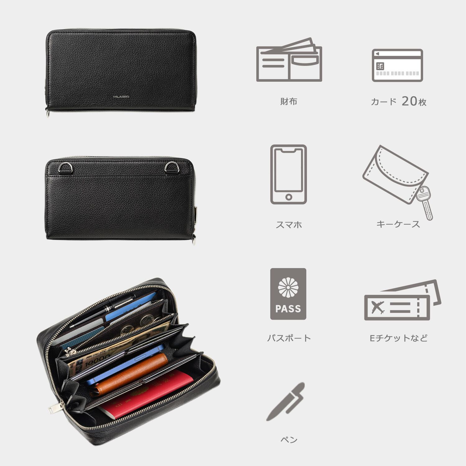カードポケットは20枚分を備え、ペン差しも装備するなど収納力も充実。財布としての機能も備えているため、海外旅行のお供にも便利にお使いいただけます。