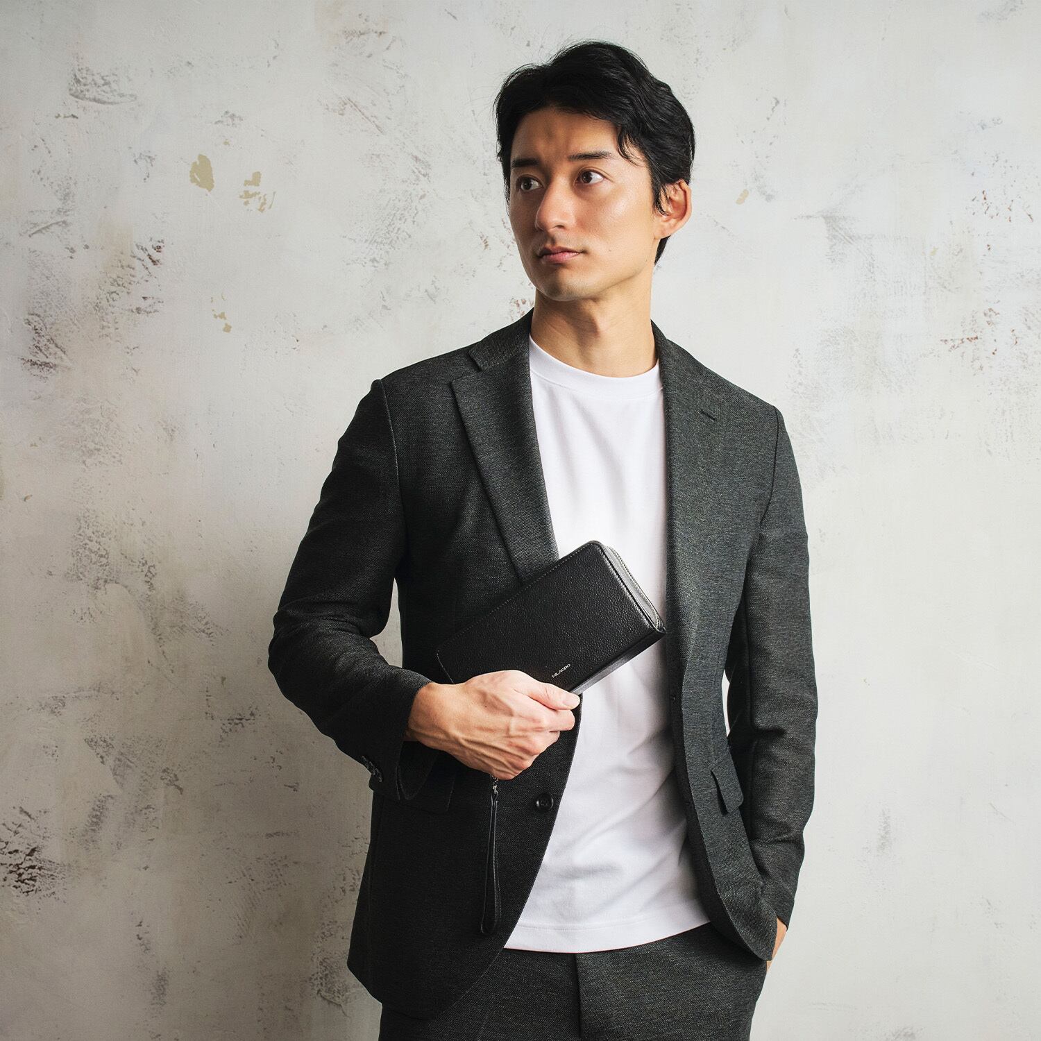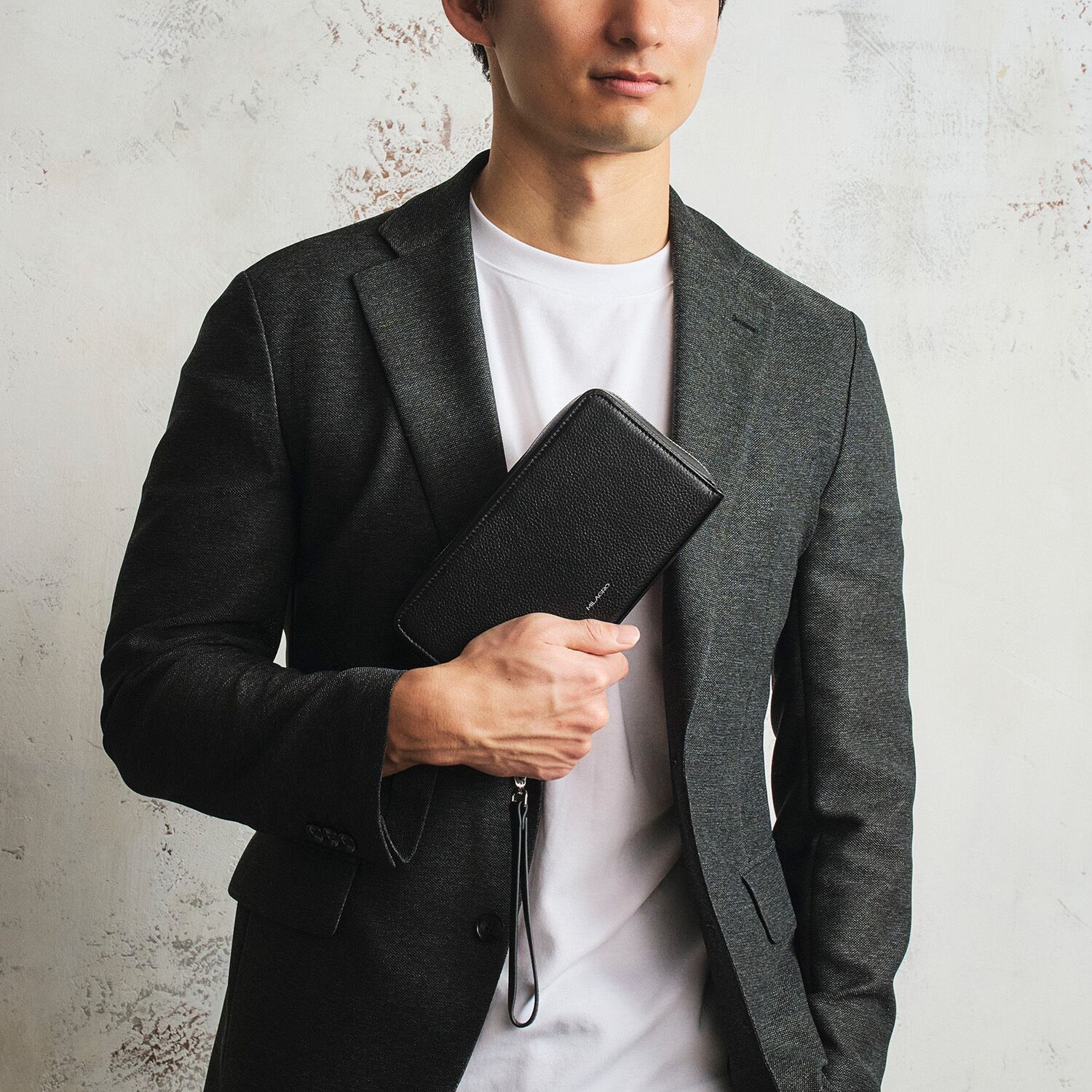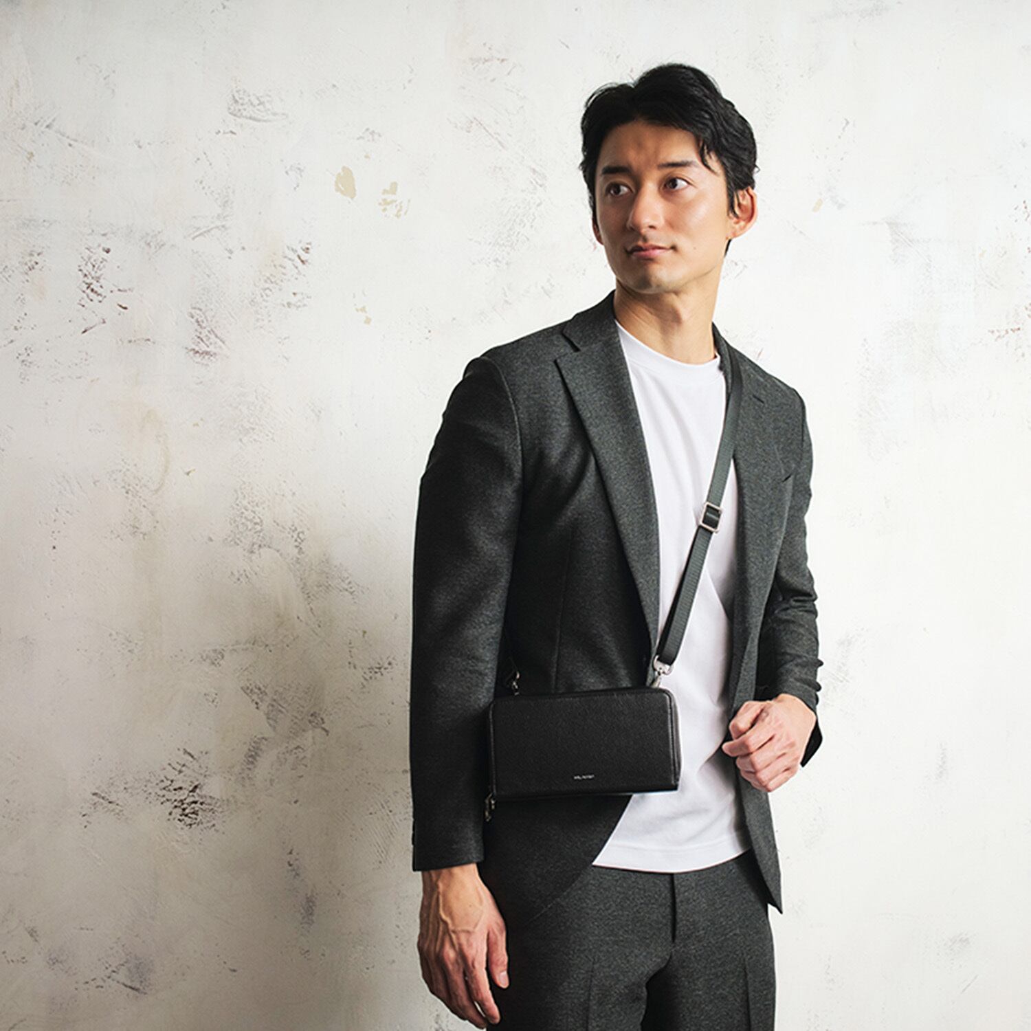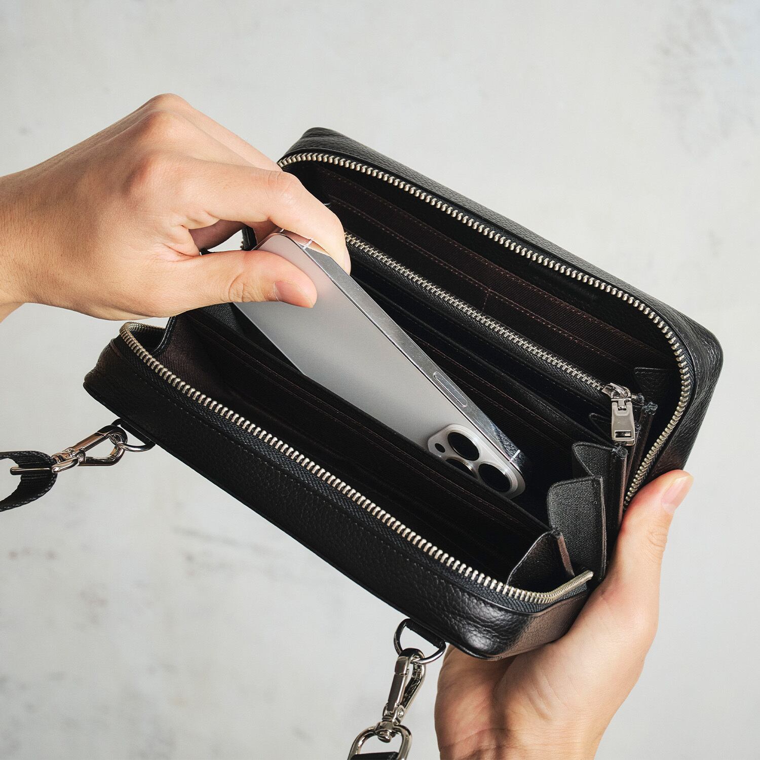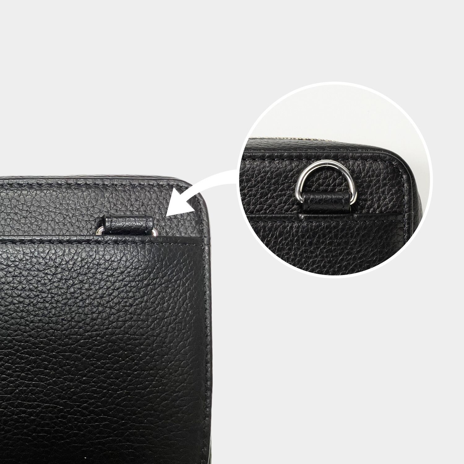 クラッチとして使うときは、ショルダー用の背面Dリングをポケットに収納できるため、すっきりとした見た目でお使いいただけます。