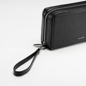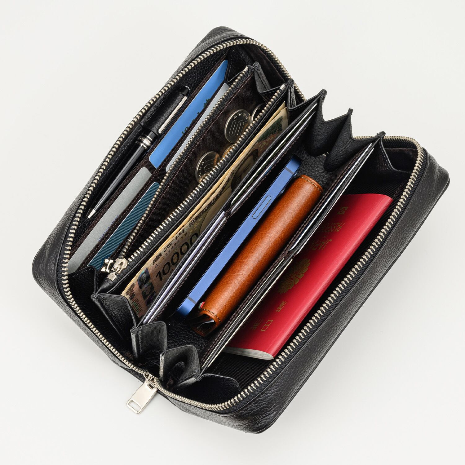 中身がこぼれにくい安心感のあるファスナー式のバッグ。大きく開く構造なので中身が見渡しやすく、出し入れもスムーズです。内部には細かな仕切りを設け、外貨やパスポート、チケットなどを整理して収納できます。